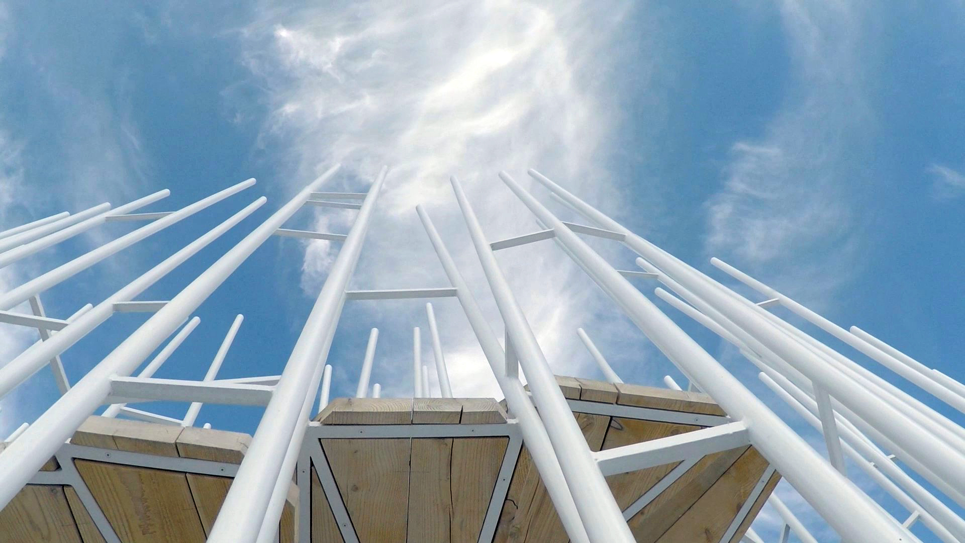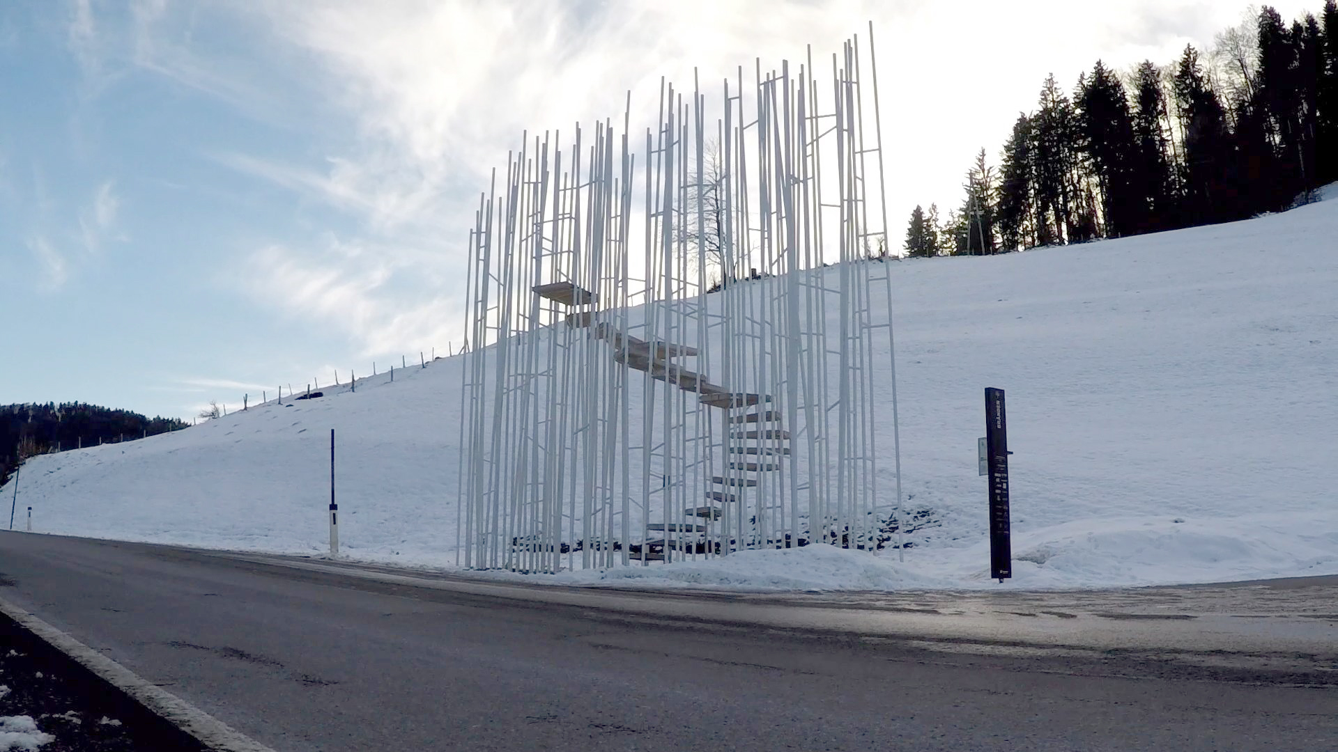 Der Architekt setzt in seinen Werken auf die Vereinigung von Natur und Architektur. Die Bushaltestelle soll den Dialog mit der Natur fördern und nicht Schutz vor ihr bieten. Das „Raumgerüst“ soll als Möglichkeit zur Interaktion dienen. Die Bushaltestelle besteht aus weiß gestrichenen dünnen Stahlstangen. Innerhalb dieser offenen Skulptur windet sich eine Stiege in die Höhe. Sie soll eine neue Dimension der Wahrnehmung von Ort, Raum und Natur ermöglichen.
